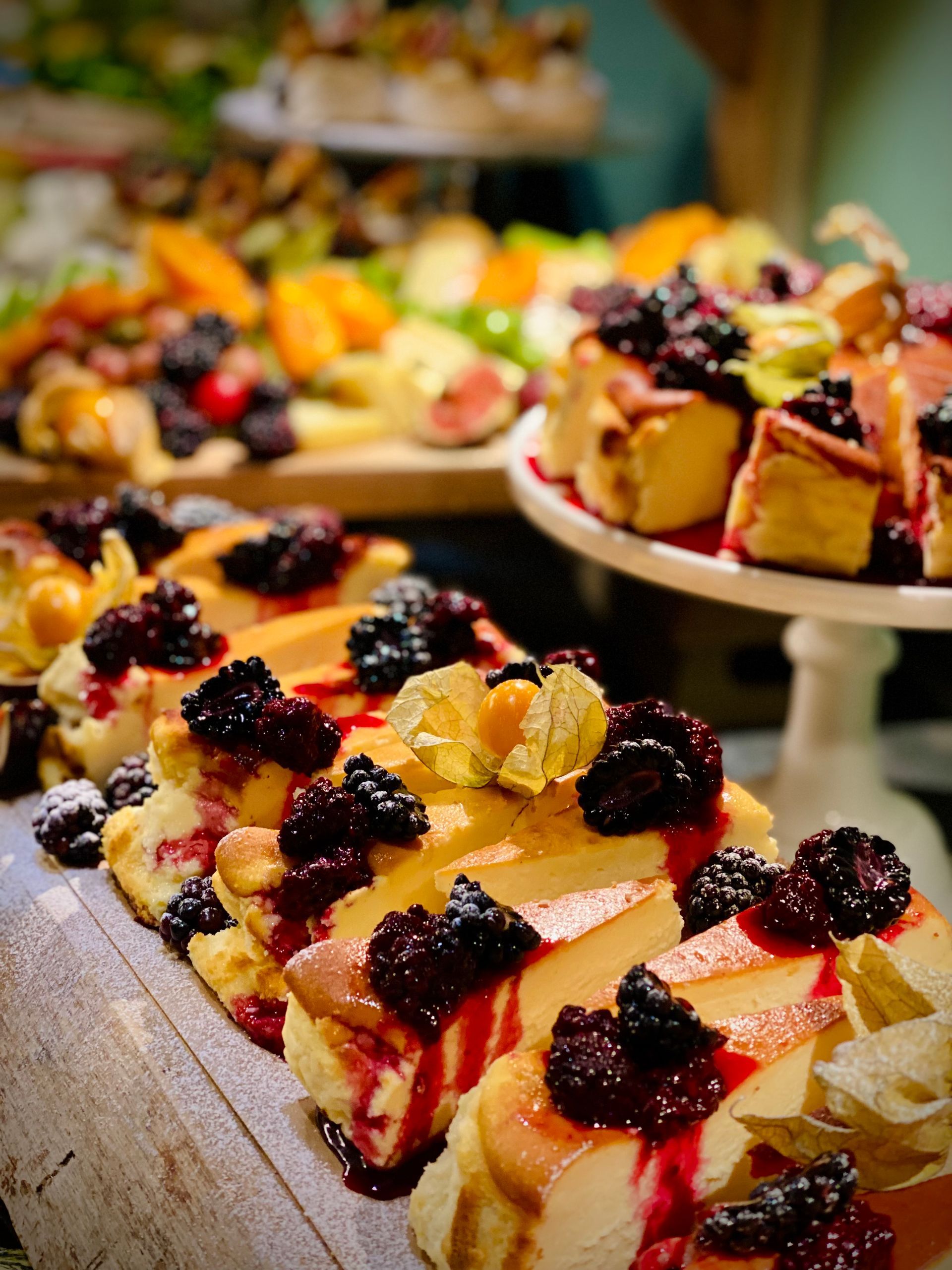 Burnt Basque cheesecake topped with seasonal fruit and honey